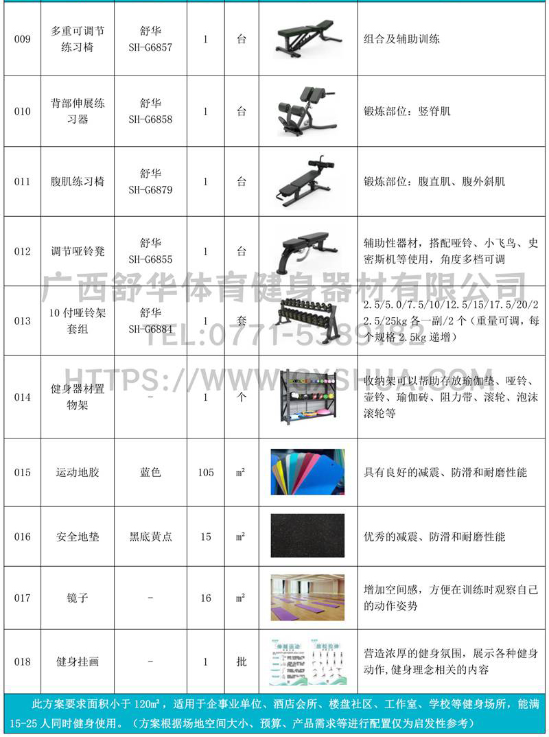 此方案要求面积小于120m²,适用于企事业单位、酒店会所、楼盘社区、工作室、学校等健身场所,能满15-25人同时健身使用。(方案根据场地空间大小、预算、产品需求等进行配置仅为启发性参考)